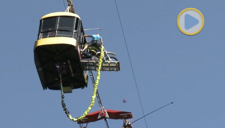 Ivars Beitāns, pioneiro do bungee jumping na Letônia, achou que seria uma ótima idéia pular de um teleférico com uma moto de motocross. Felizmente, Mattis Karro também achou uma ótima idéia e estava disposta a tentar!