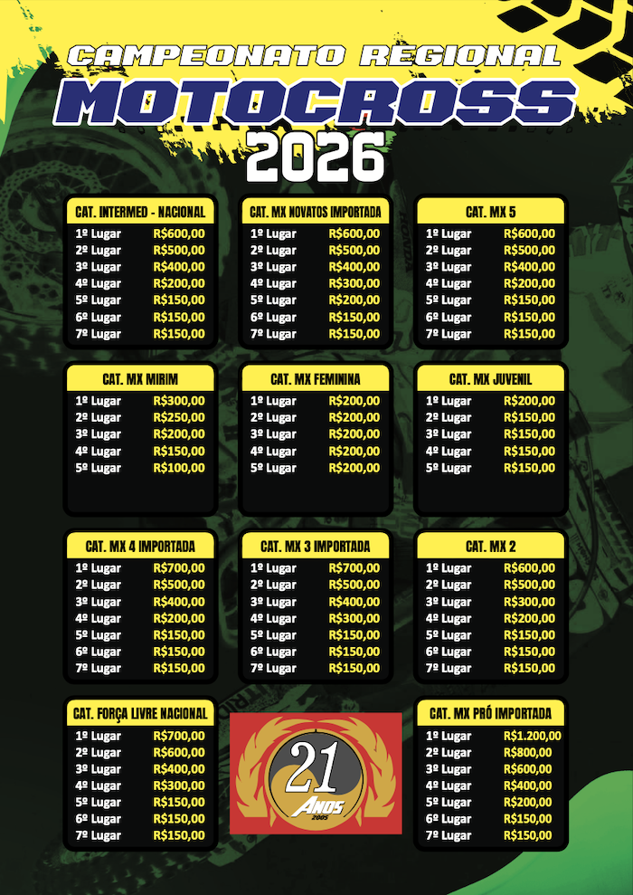 Na pista 11 categorias estarão disputando o pódio: Importada Pro, Importada MX2, Importada MX3, Importada MX4, Importada MX5, Importada Novatos, Nacional Força Livre, Nacional Intermediária, Juvenil, Feminina e Mirim. Todas categorias terão premiação e troféu.
