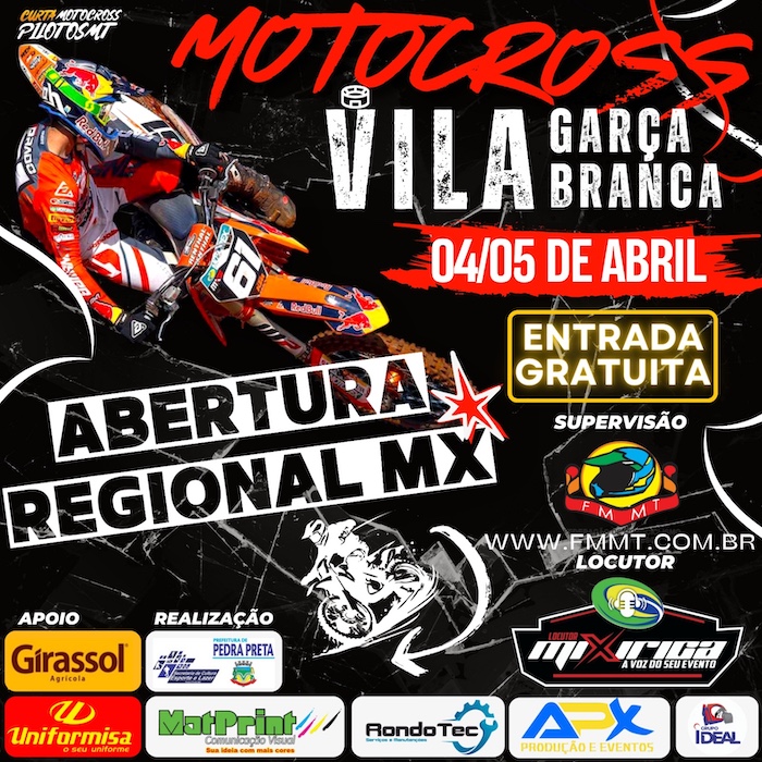 No dias 4 e 5 de Abril o distrito Vila Garça Branca localizado na BR 364 km 121 no município de Pedra Preta recebe a grande abertura do campeonato regional de motocross do estado de Mato Grosso. Mais uma vez o local muito conhecido dos pilotos vai receber o grande espetáculo.