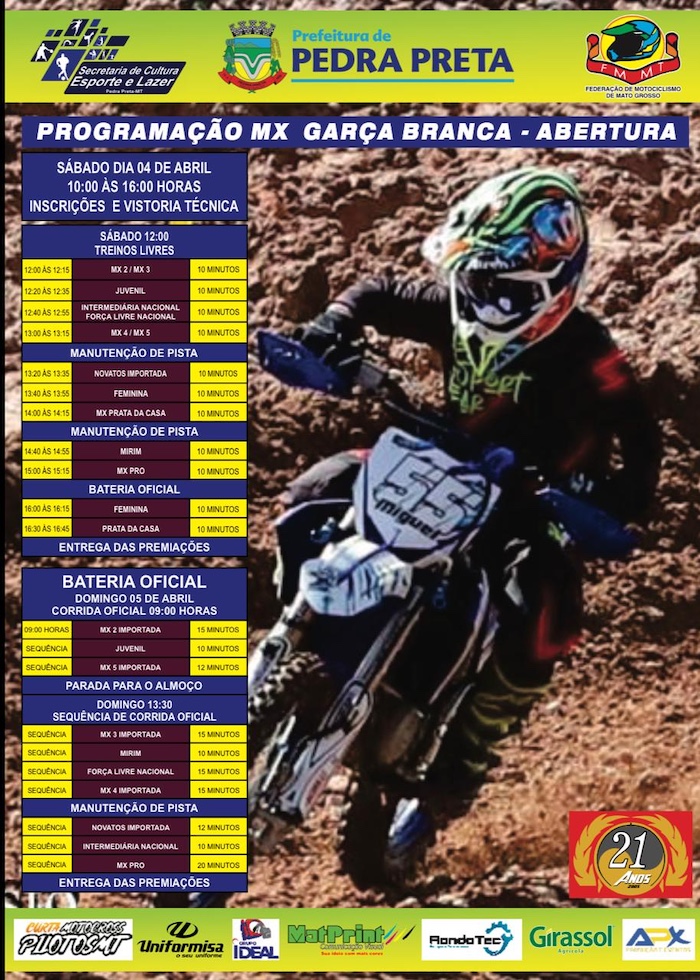 Os pilotos entram na pista no sábado com os treinos livres programados para iniciar as 12:00 horas. Duas categorias, Feminina e Prata da Casa terá suas corridas a partir das 16:00 horas. No domingo a programação inicia as 9:00 horas com a corrida da categoria Importada Mx2 e as demais na sequência.