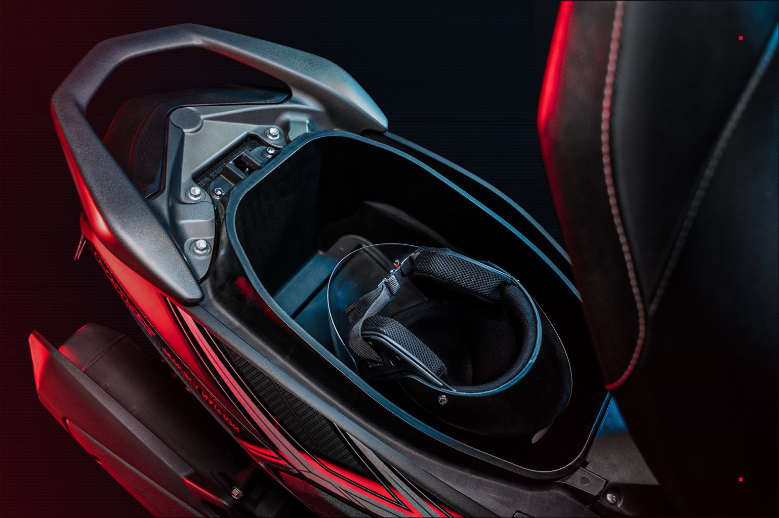 Porta-capacete – Sob o assento, um detalhe contribui – e muito – para o conforto e praticidade: um grande compartimento de armazenamento. Com capacidade de 25 litros, ele é capaz de abrigar um capacete integral e outros pequenos pertences, como uma capa de chuva.